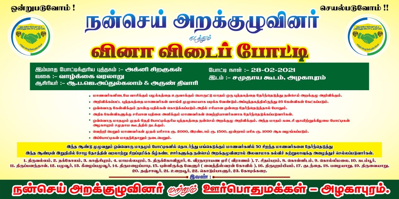 இம்மாத போட்டிக்குரிய புத்தகம் : எண்ணங்கள் வகை: மனோதத்துவம் ஆசிரியர் : எம்.எஸ்.உதயமூர்த்தி போட்டி நாள்: 28-03-2021 இடம் : சமுதாயக் கூடம் அழகாபுரம் மாணவர்களிடையே வாசிக்கும் பழக்கத்தை உருவாக்கும் பொருட்டு மாதம் ஒரு புத்தகத்தை தேர்ந்தெடுத்து நன்செய் அறக்குழு அறிவிக்கும். அறிவிக்கப்பட்ட புத்தகத்தை மாணவர்கள் வாங்கி முழுமையாகப் படிக்க வேண்டும். அப்புத்தகத்திலிருந்து 25 கேள்விகள் கேட்கப்படும். ஒவ்வொரு கேள்விக்கும் நான்கு பதில்கள் கொடுக்கப்படும். அதில் சரியான ஒன்றை தேர்ந்தெடுத்தால் போதும். அதிக கேள்விகளுக்கு சரியான பதிலை அளிக்கும் மாணவர்கள் வெற்றியாளர்களாக தேர்ந்தெடுக்கப்படுவார்கள். ஒவ்வொரு மாதமும் […]